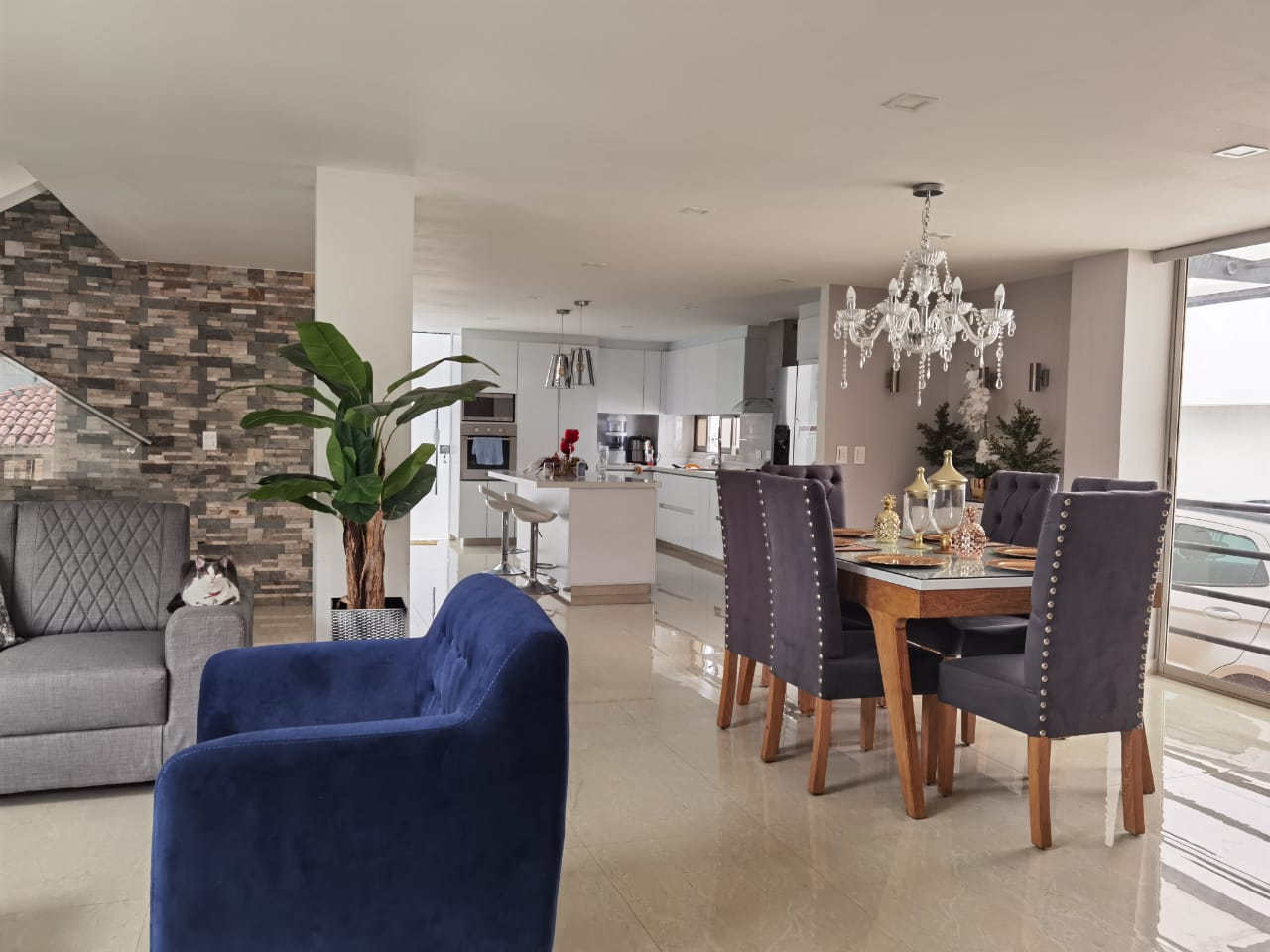 Compuesta principalmente por: Sala, comedor, cocina integral, estudio, área de ropas, terraza, 4 habitaciones (incluyendo la del servicio), 5 baños y un espacio de parqueadero para 3 carros, piscina, jacuzzi, salón social, área BBQ, parque infantil y zonas verdes.